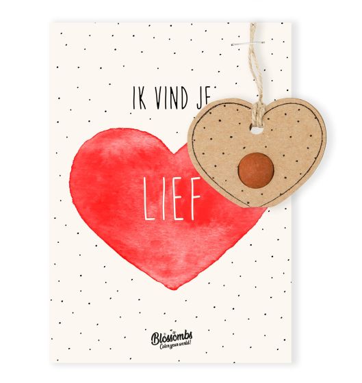 Blossombs bloem bommetjes; Hanger met 1 Blossomb mixed colours! Kaartje is voorzien van rood hart met de tekst: "ik vind je lief". Leuk voor Valentijnsdag of voor een huwelijk/bruiloft. Blossombs zijn kleurrijke bloem 'bommetjes' gemaakt in Nederland met 100% natuurlijke ingrediënten en een biologische - speciaal voor bijen en vlinders - samengestelde zadenmix van wilde bloemen. Gooi de Blossombs overal en geef kleur aan je eigen buurt: in je tuin, in een pot op je balkon, op een braakliggend stukje grond, kale berm of langs de sloot! Het enige wat jij nog moet doen is wachten op een regenbui (of een gieter gebruiken) en de Blossombs doen de rest!