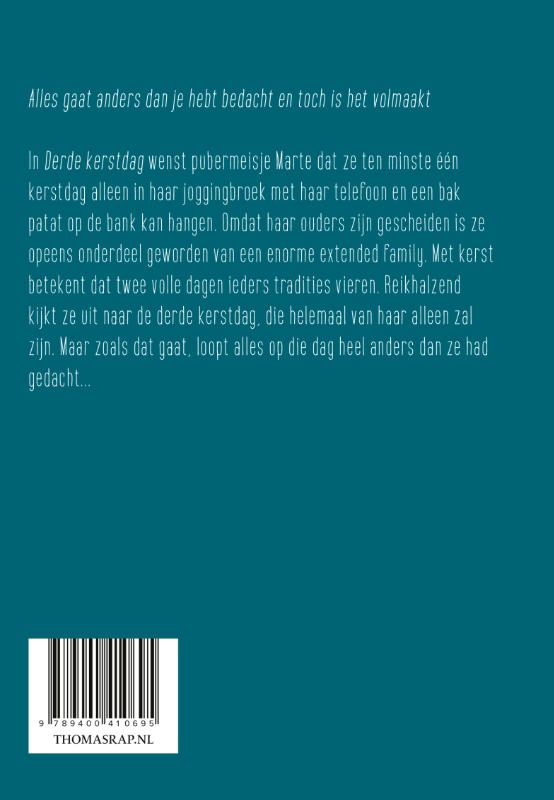 In de klassieke kerstfilm It’s a wonderful life wenst hoofdpersoon George Bailey dat hij nooit was geboren (‘I wish I’d never been born!’) en in Home Alone hoopt Kevin dat zijn familie zal verdwijnen (‘I wish my family would disappear!’). In Derde kerstdag wenst pubermeisje Marte dat ze tenminsteéén kerstdag alleen in haar joggingbroek met haar telefoon en een bakje patat op de bank kan hangen. Omdat haar ouders zijn gescheiden is ze opeens onderdeel geworden van een enorme extended family. Met kerst betekent dat twee volle dagen ‘de traditie’ vieren met mensen waar ze tegen haar zin mee zit opgescheept. Reikhalzend kijkt ze uit naar de derde kerstdag, die helemaal van haar alleen zal zijn. Maar die dag loopt alles anders dan ze had gedacht…