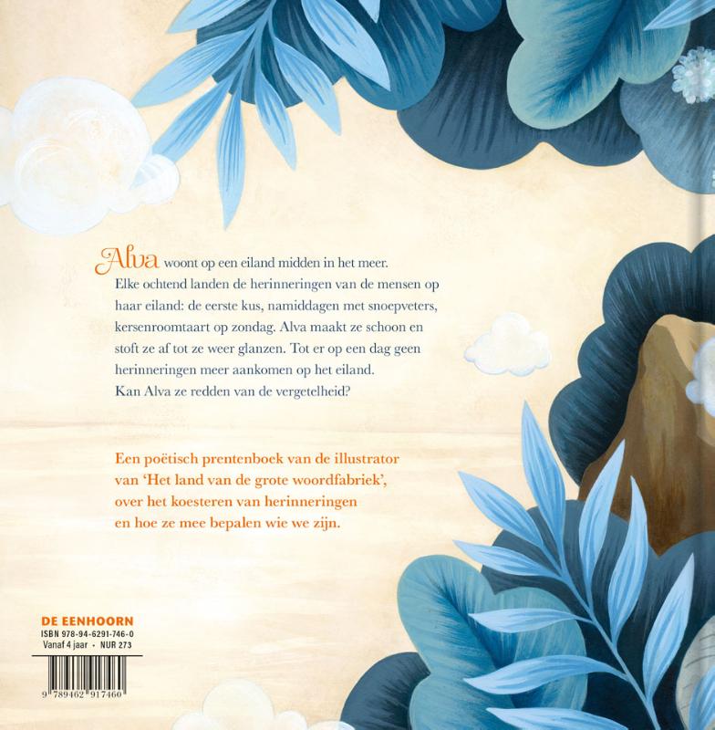 Volg samen de blauwe lijnen die de fantasie en de herinneringen tot leven wekken. Een subliem, tijdloos prentenboek over een bijzonder meisje dat herinneringen weer glans weet te geven. Alva woont op een eiland midden in het meer. Elke ochtend landen de herinneringen van de mensen op haar eiland: de eerste kus, namiddagen met snoepveters, kersenroomtaart op zondag. Sommige herinneringen zijn kleurig en schel, spannend en stout, andere zijn rustig en wijs. Alva maakt ze schoon en stoft ze af tot ze weer glanzen. Tot er op een dag geen herinneringen meer aankomen op het eiland. Kan Alva ze redden van de vergetelheid?