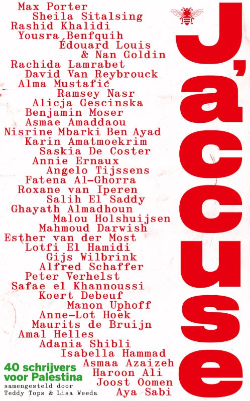Met bijdragen van Fatena Al-Ghorra, Haroon Ali, Ghayath Almadhoun, Asmae Amaddaou, Karin Amatmoekrim, Asmaa Azaizeh, Yousra Benfquih, Maurits de Bruijn, Saskia de Coster, Koert Debeuf, Mahmoud Darwish, Annie Ernaux, Alicja Gescinska, Nan Goldin, Isabella Hammad, Lotfi El Hamidi, Amal Helles, Anne-Lot Hoek, Malou Holshuijsen, Roxane van Iperen, Rashid Khalidi, Safae el Khannoussi, Rachida Lamrabet, Édouard Louis, Nisrine Mbarki, Benjamin Moser, Esther van der Most, Alma Mustafić, Ramsey Nasr, Joost Oomen, Max Porter, David Van Reybrouck, Aya Sabi, Salih El Saddy, Alfred Schaffer, Adania Shibli, Sheila Sitalsing, Angelo Tijssens, Teddy Tops, Manon Uphoff, Peter Verhelst, Lisa Weeda en Gijs Wilbrink.