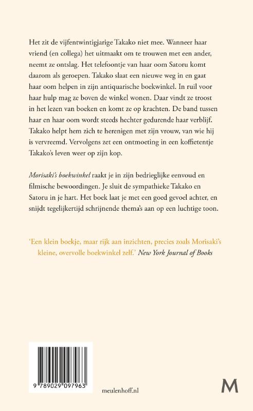 Morisaki’s boekwinkel raakt je in zijn bedrieglijke eenvoud en filmische bewoordingen. Je sluit de sympathieke Takako en Satoru in je hart. Het boek laat je met een goed gevoel achter, en snijdt tegelijkertijd schrijnende thema’s aan op een luchtige toon.