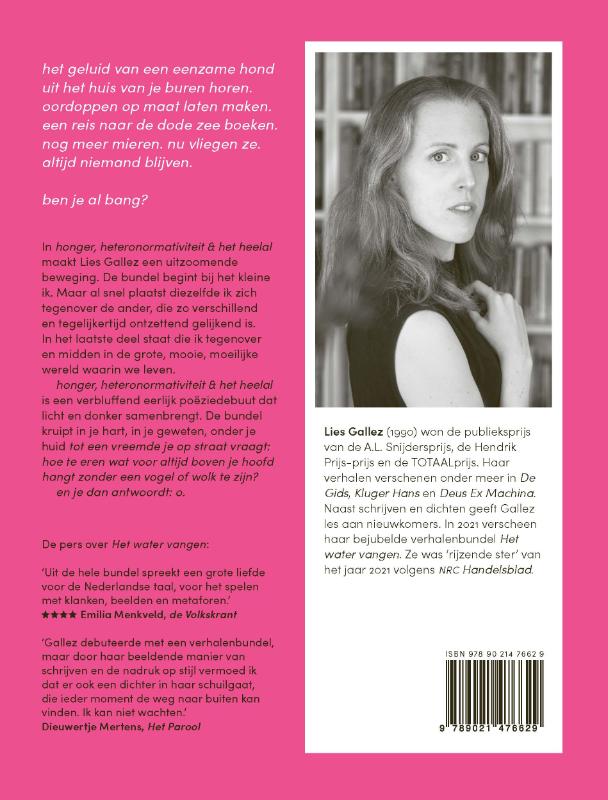 In honger, heteronormativiteit & het heelal maakt Lies Gallez een uitzoomende beweging. De bundel begint bij het kleine ik. Maar al snel plaatst diezelfde ik zich tegenover de ander, die zo verschillend en tegelijkertijd ontzettend gelijkend is. In het laatste deel staat die ik tegenover en midden in de grote, mooie, moeilijke wereld waarin we leven.