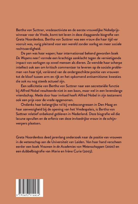 Bertha von Suttner, vredesactiviste en de eerste vrouwelijke Nobelprijswinnaar voor de Vrede, komt tot leven in deze diepgaande biografie van Greta Noordenbos. Bertha von Suttner was een vrouw die haar tijd ver vooruit was, vurig pleitend voor een wereld zonder oorlog en meer sociale rechtvaardigheid. De pen was haar wapen; haar internationaal bekend geworden boek De Wapens neer! vormde een krachtige aanklacht tegen de vernietigende impact van oorlogen op zowel mensen als dieren. Ze wendde haar scherpe intellect ook aan om kritisch commentaar te leveren op de sociale problemen van haar tijd, variërend van de ondergeschikte positie van vrouwen tot de kloof tussen arm en rijk en het opkomend antisemitisme: kwesties die ook nu nog steeds actueel zijn. Een sollicitatie van Bertha von Suttner naar een secretariële functie bij Alfred Nobel resulteerde niet in een baan, maar wel in een levenslange vriendschap. Mede door haar invloed heeft Alfred Nobel in zijn testament ook een prijs voor de vrede opgenomen. Ondanks haar belangrijke rol bij vredescongressen in Den Haag en haar aanwezigheid bij de opening van het Vredespaleis, is Bertha von Suttner relatief onbekend gebleven in Nederland. Deze biografie wil die lacune opvullen en de erfenis van deze invloedrijke vrouw in de schijnwerpers plaatsen. Greta Noordenbos deed jarenlang onderzoek naar de positie van vrouwen in de wetenschap aan de Universiteit van Leiden. Van haar hand verscheen eerder een boek Vrouwen in de Academies van Wetenschappen (2020) en een dubbelbiografie van Marie en Irène Curie (2003).