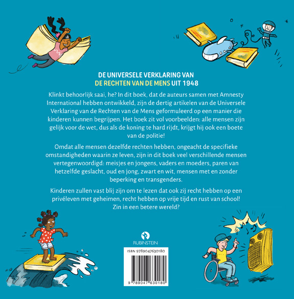 Klinkt behoorlijk saai, he? In dit boek, dat de auteurs samen met Amnesty International hebben ontwikkeld, zijn de dertig artikelen van de Universele Verklaring van de Rechten van de Mens geformuleerd op een manier die kinderen kunnen begrijpen. Het boek zit vol voorbeelden: alle mensen zijn gelijk voor de wet, dus als de koning te hard rijdt, krijgt hij ook een boete van de politie! Omdat alle mensen dezelfde rechten hebben, ongeacht de specifieke omstandig heden waarin ze leven, zijn in dit boek veel verschillende mensen vertegenwoordigd: meisjes en jongens, vaders en moeders, paren van hetzelfde geslacht, oud en jong, zwart en wit, mensen met en zonder beperking en transgenders. Kinderen zullen vast blij zijn om te lezen dat ook zij recht hebben op een privéleven met geheimen, recht hebben op vrije tijd en rust van school! Zin in een betere wereld?
