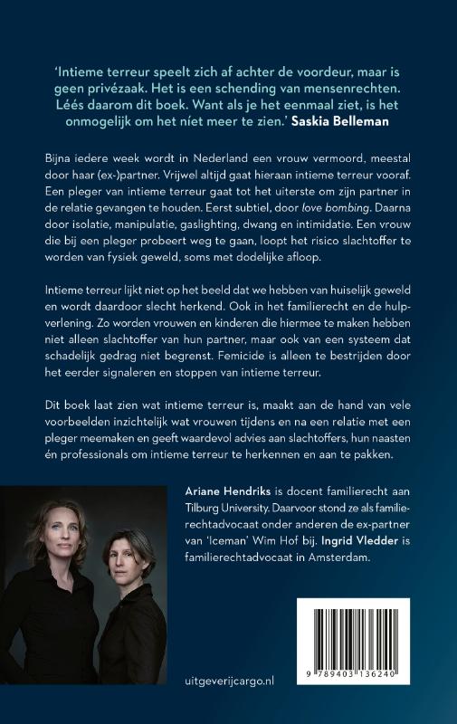 Dit boek laat zien wat intieme terreur is, maakt aan de hand van vele voorbeelden inzichtelijk wat vrouwen tijdens en na een relatie met een pleger meemaken en geeft waardevol advies aan slachtoffers, hun naasten én professionals om intieme terreur te herkennen en aan te pakken.