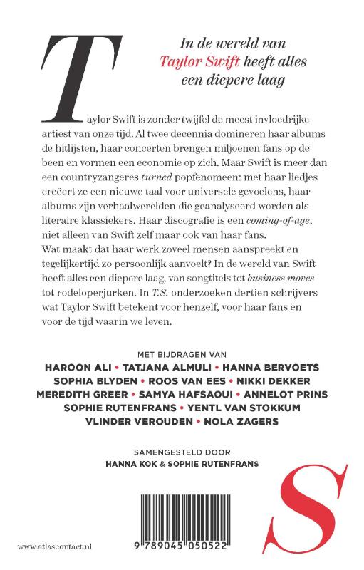 In T.S. onderzoeken dertien schrijvers wat Taylor Swift betekent voor henzelf, voor haar fans en voor de tijd waarin we leven. Met bijdragen van Haroon Ali, Tatjana Almuli, Hanna Bervoets, Sophia Blyden, Nikki Dekker, Roos van Ees, Meredith Greer, Samya Hafsaoui, Annelot Prins, Sophie Rutenfrans, Yentl van Stokkum, Vlinder Verouden, Nola Zagers.