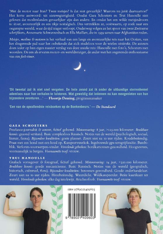 ‘Met de motor naar Iran? Twee meisjes? Is dat niet gevaarlijk? Waarom nu juist daarnaartoe?’ Het korte antwoord: uit nieuwsgierigheid. Omdat Gaea Schoeters en Trui Hanoulle niet geloven dat moslimlanden gevaarlijker zijn dan andere. En omdat het een wilde meisjesdroom is: stoer, avontuurlijk en een tikje nostalgisch. Dus vertrekken ze, oostwaarts, op zoek naar een ongerepte wereld, waar de tijd trager verloopt. Onderweg volgen ze het spoor van twee Zwitserse schrijfsters, Annemarie Schwarzenbach en Ella Maillart, die in 1939 samen naar Afghanistan reden.