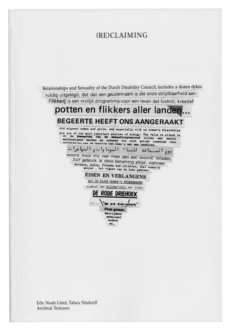 The book (Re)claiming presents ways in which various queer and feminist communities and initiatives in the Netherlands have (re)claimed the triangle—along with other symbols, words and stories—and in doing so take up an empowering position in a hostile society. (Re)claiming can mean both a proud identification with, and protest against the stigmatization for which a symbol, word, gesture or story was designed.