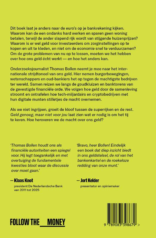 Dit boek laat je anders naar de euro’s op je bankrekening kijken. Waarom kan de een ondanks hard werken en sparen geen woning betalen, terwijl de ander slapend rijk wordt van stijgende huizenprijzen? Waarom is er wel geld voor investeerders om zorginstellingen op te kopen en uit te kleden, en niet om de economie snel te verduurzamen? Om de grote problemen van nu op te lossen, moeten we het hebben over hoe ons geld écht werkt — en hoe het anders kan. Onderzoeksjournalist Thomas Bollen neemt je mee naar het internationale strijdtoneel van ons geld. Hier nemen burgerbewegingen, wetenschappers en oud-bankiers het op tegen de machtigste bedrijven ter wereld. Samen reizen we langs de goudkluizen en banktorens van de gevestigde financiële orde. We volgen hoe geld door de samenleving stroomt en ontrafelen hoe tech-miljardairs en cryptobedrijven met hun digitale munten stilletjes de macht overnemen. Als we niet ingrijpen, groeit de kloof tussen de superrijken en de rest. Geld genoeg, maar niet voor jou laat zien wat er nodig is om het tij te keren. Hoe heroveren we de macht over ons geld? Reacties: Klaas Knot, president De Nederlandsche Bank van 2011 tot 2025: ‘Thomas Bollen houdt ons als financiële autoriteiten een spiegel voor. Hij legt toegankelijk en met overtuiging de fundamentele kwesties bloot waar de discussie over moet gaan.’ Jort Kelder, presentator en opiniemaker: ‘Bravo, heer Bollen! Eindelijk een boek dat diep inzicht biedt in ons geldstelsel, de rol van het bankenkartel en de roekeloze redding van onze munt.’ Abel van Gijlswijk, zanger Hang Youth: ‘Gevaarlijk scherp. Bollen schrijft over geld op een manier die elke proleet kan begrijpen. Als ik bankier was, zou ik willen dat dit boek werd verboden.’ Mirjam de Rijk, journalist en columnist voor De Groene Amsterdammer: ‘Dit boek over de verontrustende wereld van het grote geld leest als een trein. Dan weet je dat het raak is.’