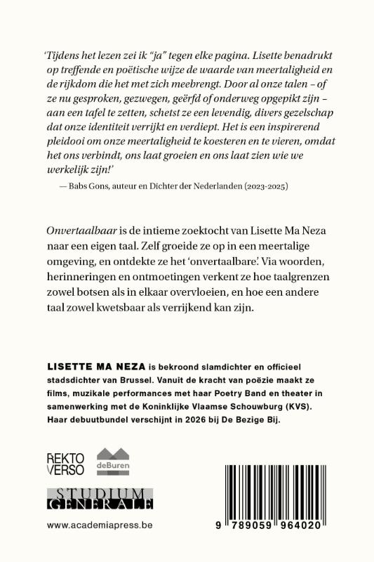 Onvertaalbaar is de intieme zoektocht van Lisette Ma Neza naar een eigen taal. Zelf groeide ze op in een meertalige omgeving, en ontdekte ze het 'onvertaalbare'. Via woorden, herinneringen en ontmoetingen verkent ze hoe taalgrenzen zowel