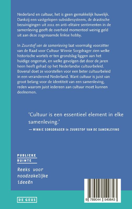 In Zuurstof van de samenleving laat voormalig voorzitter van de Raad voor Cultuur Winnie Sorgdrager zien welke historische wortels er ten grondslag liggen aan het huidige ongemak, en welke gevolgen dat door de jaren heen heeft gehad op het Nederlandse cultuurbeleid. Bovenal doet ze voorstellen voor een beter cultuurbeleid in een veranderend Nederland. Want cultuur is juist van groot belang voor de identiteit van een samenleving, reden waarom juist iedereen aan cultuur moet kunnen deelnemen.