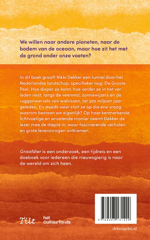 In haar tweede boek graaft Nikki Dekker een tunnel door het Nederlandse landschap, specifieker nog: De Groote Peel. Hoe dieper ze komt, hoe verder ze in het verleden reist, langs de veenmol en pratende schimmels, de ruilverkaveling en vervening naar het oerrund en de uitvinding van de klok, via het jaar 0 en de periode waarin walvissen en reuzenhaaien overzwemmen, tot 300 miljoen jaar geleden.