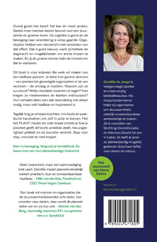 ‘Wil jij op je werk eindelijk écht planeetvriendelijker handelen, maar weet je niet waar te beginnen? Dit boek geeft je precies die schop onder je kont die je nodig hebt. Met haar frisse blik en onweerstaanbare enthousiasme laat Daniëlle je zien hoe makkelijk en leuk het is om het verschil te maken.’ – Hille van der Kaa, Foodheld en CEO Those Vegan Cowboys