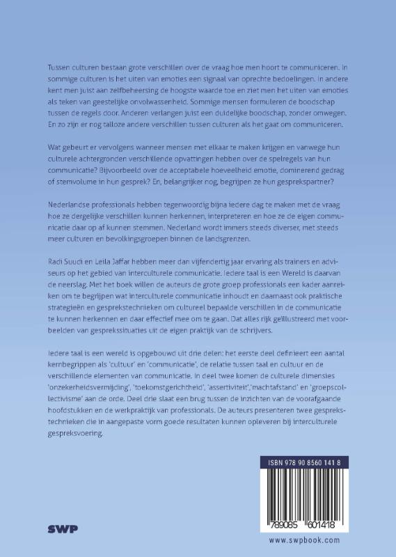 Tussen culturen bestaan grote verschillen over de vraag hoe men hoort te communiceren. In sommige culturen is het uiten van emoties een signaal van oprechte bedoelingen. In andere kent men juist aan zelfbeheersing de hoogste waarde toe en ziet men het uiten van emoties als teken van geestelijke onvolwassenheid. Sommige mensen formuleren de boodschap tussen de regels door. Anderen verlangen juist een duidelijke boodschap, zonder omwegen. En zo zijn er nog talloze andere verschillen tussen culturen als het gaat om communiceren. Wat gebeurt er vervolgens wanneer mensen met elkaar te maken krijgen en vanwege hun culturele achtergronden verschillende opvattingen hebben over de spelregels van hun communicatie? Bijvoorbeeld over de acceptabele hoeveelheid emotie, dominerend gedrag of stemvolume in hun gesprek? En, belangrijker nog, begrijpen ze hun gesprekspartner? Nederlandse professionals hebben tegenwoordig bijna iedere dag te maken met de vraag hoe ze dergelijke verschillen kunnen herkennen, interpreteren en hoe ze de eigen communicatie daar op af kunnen stemmen. Nederland wordt immers steeds diverser, met steeds meer culturen en bevolkingsgroepen binnen de landsgrenzen. Radi Suudi en Leila Jaffar hebben meer dan vijfendertig jaar ervaring als trainers en adviseurs op het gebied van interculturele communicatie. Iedere taal is een Wereld is daarvan de neerslag. Met het boek willen de auteurs de grote groep professionals een kader aanreiken om te begrijpen wat interculturele communicatie inhoudt en daarnaast ook praktische strategieën en gesprekstechnieken om cultureel bepaalde verschillen in de communicatie te kunnen herkennen en daar effectief mee om te gaan. Dat alles rijk geïllustreerd met voorbeelden van gesprekssituaties uit de eigen praktijk van de schrijvers. Iedere taal is een wereld is opgebouwd uit drie delen: het eerste deel definieert een aantal kernbegrippen als ‘cultuur’ en ’communicatie’, de relatie tussen taal en cultuur en de verschillende elementen van communicatie. In deel twee komen de culturele dimensies ‘onzekerheidsvermijding’, ‘toekomstgerichtheid’, ‘assertiviteit’,‘machtafstand’ en ‘groepscollectivisme’ aan de orde. Deel drie slaat een brug tussen de inzichten van de voorafgaande hoofdstukken en de werkpraktijk van professionals. De auteurs presenteren twee gesprekstechnieken die in aangepaste vorm goede resultaten kunnen opleveren bij interculturele gespreksvoering.