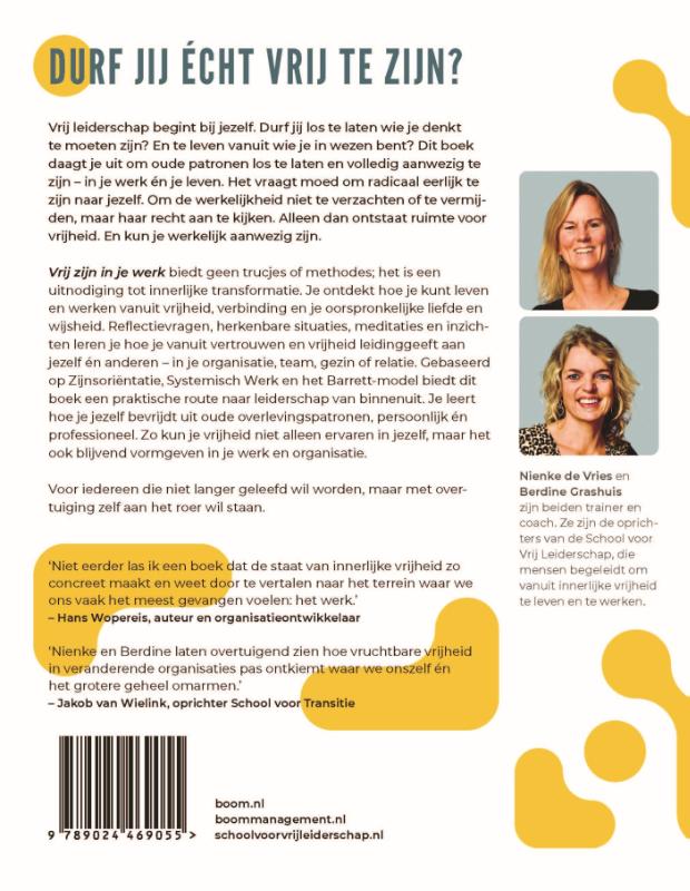 Vrij leiderschap begint bij jezelf. Durf jij los te laten wie je denkt te moeten zijn? En te leven vanuit wie je in wezen bent? Dit boek daagt je uit om oude patronen los te laten en volledig aanwezig te zijn – in je werk én je leven. Het vraagt moed om radicaal eerlijk te zijn naar jezelf. Om de werkelijkheid niet te verzachten of te vermijden, maar haar recht aan te kijken. Alleen dan ontstaat ruimte voor vrijheid. En kun je werkelijk aanwezig zijn.