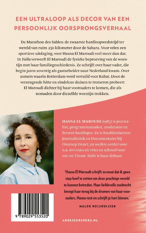De Marathon des Sables: de zwaarste hardloopwedstrijd ter wereld van ruim 250 kilometer door de Sahara. Voor velen een sportieve uitdaging, voor Hasna El Maroudi veel meer dan dat. In Yalla verweeft El Maroudi de fysieke beproeving van de woestijn met haar familiegeschiedenis. Ze schrijft over haar vader, die begin jaren zeventig als gastarbeider naar Nederland kwam. Over zomers waarin Rotterdam werd verruild voor Rabat. Door de verzengende hitte en eindeloze duinen te trotseren probeert El Maroudi dichter bij haar voorouders te komen, die als nomaden door diezelfde woestijn trokken.